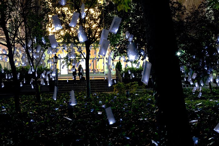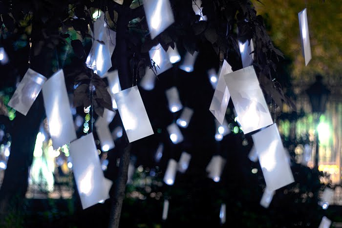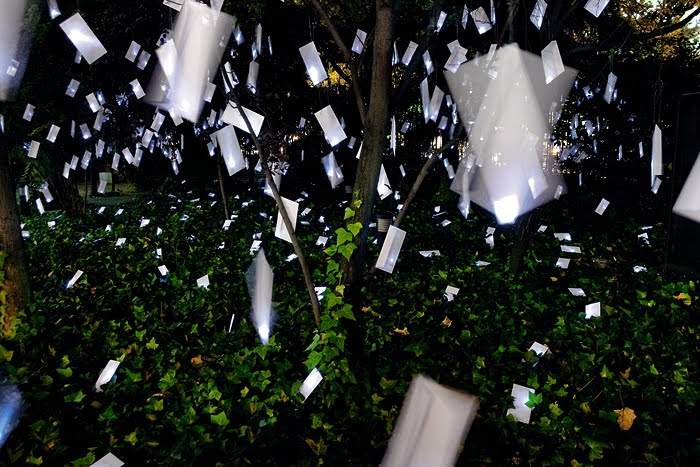 The lit envelopes remained hanging in the garden for 3 days, serving as intimate illumination for the poetic festival. The last night, with light still in the interior, they were offered to the public as keepsakes, or better yet, for them to address to a loved one, to whom we would send the envelope.