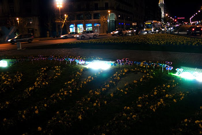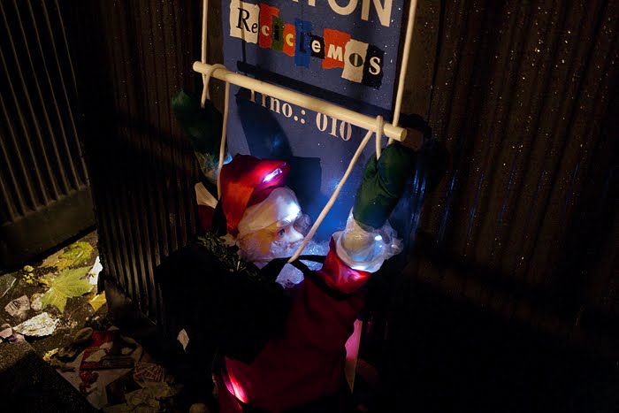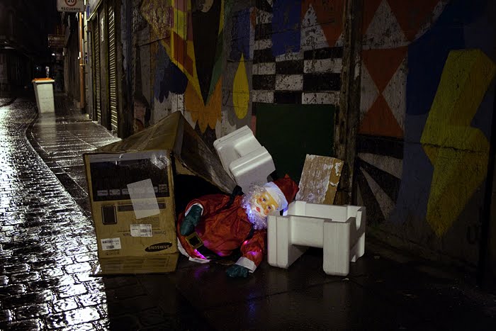 Our Christmas action, of minimum cost, we call Shopping with Santa Claus and to carry it out, we simply acquired two typical Christmas dolls, from the corner store, we covered them with lights and transporting them in a shopping cart, we walked during the night, through the streets in the center of the city, inspecting the discarded objects we found along the way.