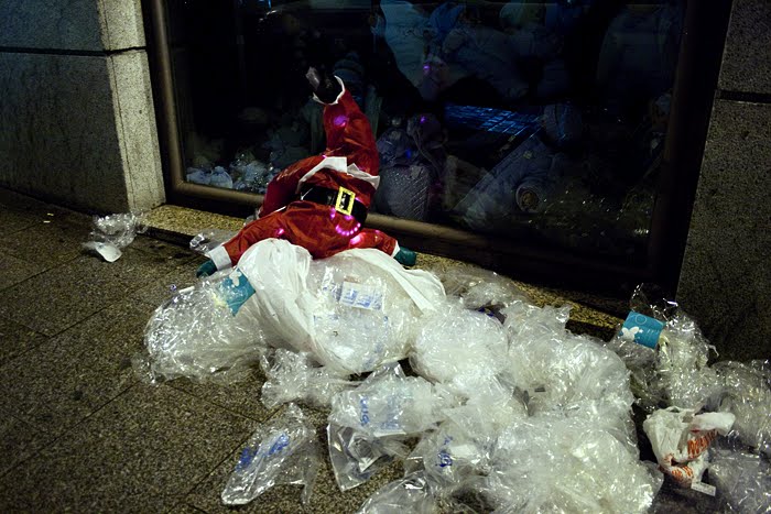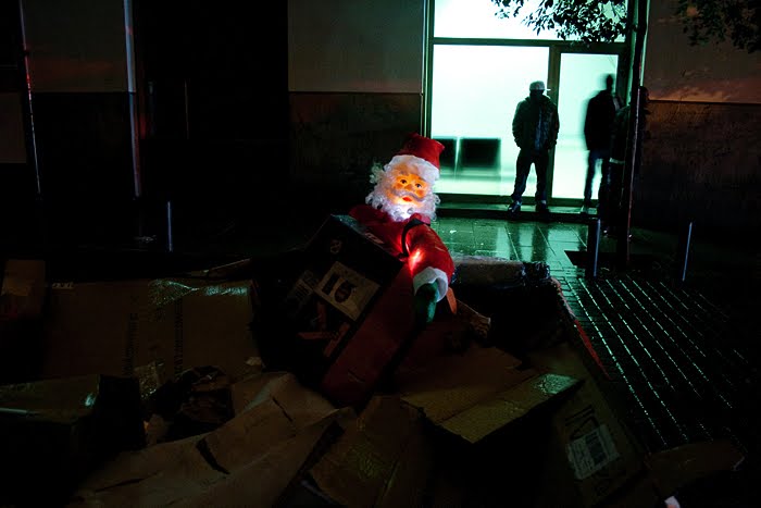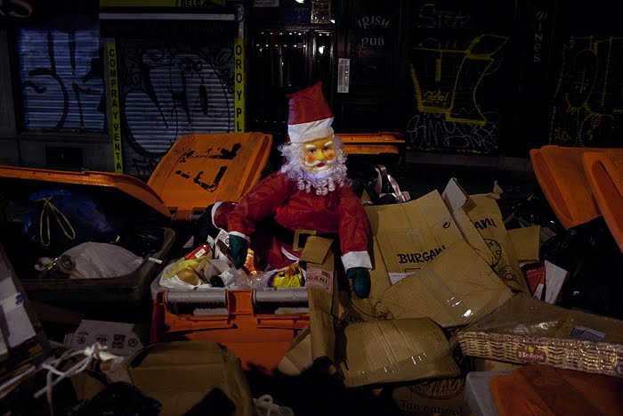 A nuestra acción navideña, de mínimo coste, la llamamos De compras con Santa Claus y para llevarla a cabo, simplemente adquirimos dos típicos muñecos navideños, en la tienda de la esquina, los llenamos de luces y transportándolos en un carrito de la compra, anduvimos durante la noche, por las calles del centro, interviniendo en los deshechos que fuimos encontrándo a nuestro paso.