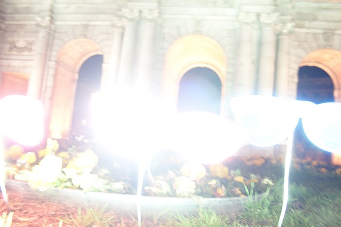 Para ello, plantamos 100 gáfas de sol, de gran tamaño y variados colores, delante de los potentes focos de la puerta, y allí las dejamos, balanceándose ligeramente al viento y tamizándo inapreciablemente el reflejo de la luz sobre la superficie de piedra. Por supuesto no hizo falta iluminar la pieza